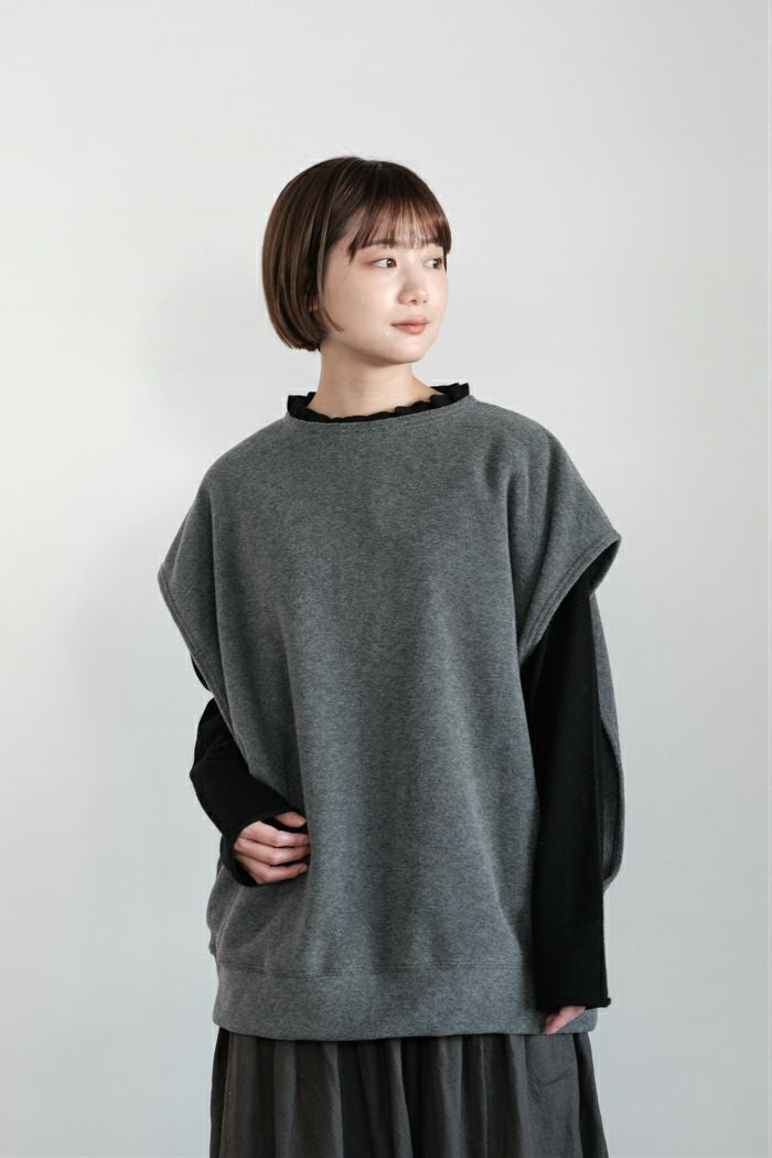 アームが大きく開いているので、中に着るインナーのシルエットを気にすることなく着用できます。ドルマンスリーブ、ワンピースなど、様々なアイテムの上に重ねて着用することができます。