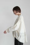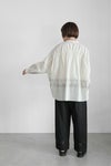 前裾に通した紐で絞りを入れてシルエットの変化を楽しめるストリングシャツ。 前後差のある着丈は、パンツ・スカート共に合わせやすく、 裾を絞って一枚で着ても、 ボタンを開けて羽織りとしても着回せます。 前後差のある着丈と立体的なシルエットがこなれた雰囲気を演出します。