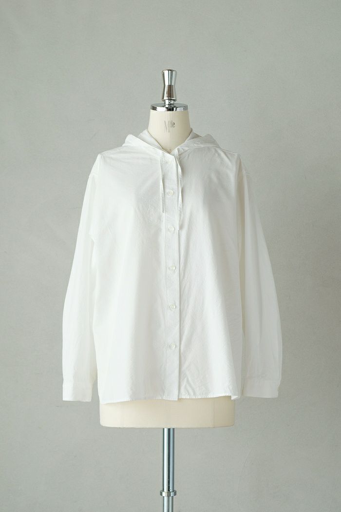 羽織としてもブラウスとしても着回しの利く、季節の変わり目にぴったりのフード付きブラウス。 オーガニックコットンとリサイクルレーヨンの混紡生地で、レーヨンを混紡することで柔らかく上品な艶が生まれます。生地に小さな洗い機で少量ずつ丁寧に揉み洗う事により、ざくっとした粗野感のある生地に小じわを入れ、無地部分にも凹凸が出てこなれた印象になるマグワッシャー加工を施しています。