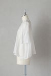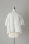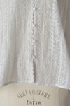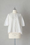 身頃の前後に繊細なピンタック&リバーレースを施した華やかなデザイン。 共布のくるみボタンも可愛いアクセントになっています。 たっぷりギャザーを寄せ、ふんわり広がる袖は上品で軽やかなシルエットです。