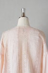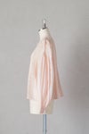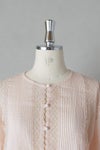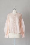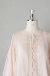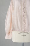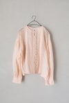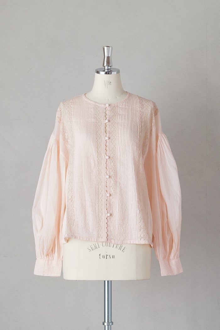 身頃の前後に繊細なピンタック&リバーレースを施した華やかなデザイン。 共布のくるみボタンも可愛いアクセントになっています。 たっぷりギャザーを寄せ、ふんわり広がる袖は上品で軽やかなシルエットです。