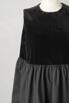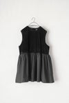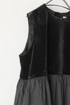 上下を異素材で切り替えたノースリーブプルオーバー。 ウエストからは光沢の美しいスノーベロア素材。 中空糸を使ったベロアなので、 通常のベロアより膨らみ感と柔らかさを持ち合わせており、 ストレッチを入れることでより着心地がよくなっています。