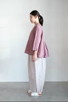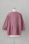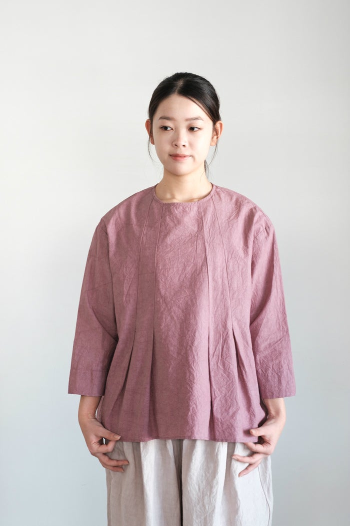 洗いのかかったウォッシャー感のある生地を使用したブラウス。 膨らみとムラ感を宿した染めの風合いが、シンプルな佇まいにこなれた余韻を添えるアイテムです。 天然素材ならではのナチュラルな表情と、ほどよいハリ感がシルエットを美しく保ちます。着込むほどにやわらかく馴染み、経年変化も楽しめる一着です