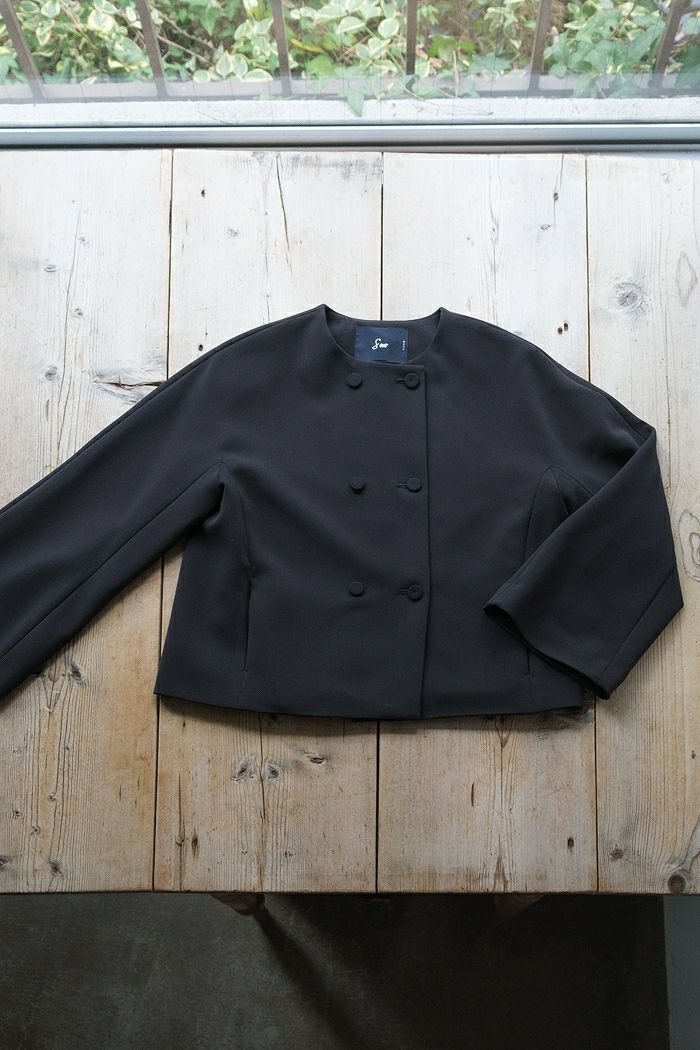 ゆるめの身幅で肩先は少しドロップします。 ノーカラーの丸首で、フロントはダブル仕立て。 共生地のくるみボタンが並んで若々しいアクセントに。 両脇にスラッシュポケット、総裏付き。 同シリーズのワンピースやボトムに合わせていただくと、 よりフォーマル感がUPして、セレモニーにぴったりです。