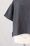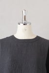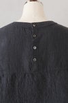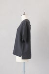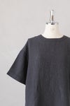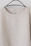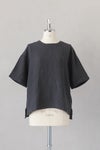 風通しのよい広めの袖幅で、肌に張り付かない心地よい素材感。 バックヨークの切替えと、背中に並んだボタンがポイントです。 衿ぐりは2本ステッチのしっかりとした仕上げ。 ワイドな身幅のボックスシルエットで、ふわっと軽い着心地です。