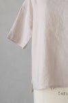 風通しのよい広めの袖幅で、肌に張り付かない心地よい素材感。 バックヨークの切替えと、背中に並んだボタンがポイントです。 衿ぐりは2本ステッチのしっかりとした仕上げ。 ワイドな身幅のボックスシルエットで、ふわっと軽い着心地です。 両サイドにスリット入りで、後ろ丈が少し長め。 どんなボトムとも相性よく、Tシャツ感覚で着ていただけるシンプルな一枚です。