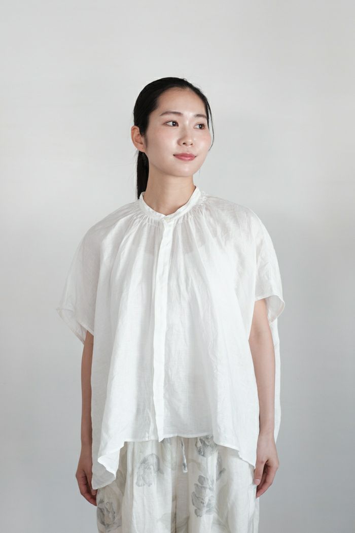 襟周りにゴムシャーリングを入れた女性らしいデザイン。 繊細なギャザーの表情が美しく、デザインポイントとなっています。 前立てはすっきりとした比翼仕立てで、 ふんわりと涼しく着ていただけるシルエット。 袖はドロップして二の腕が隠れます。 後ろ丈が長めで、 ラウンドした裾ラインが軽やか。 アームホールが広めなので、 インナーを着用して下さい。