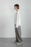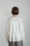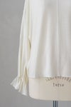 裾と袖口はオーバーロック始末。前見頃と後ろ見頃中心に切り替えが入っています。 袖口にはゴムが入っているので、ブラウジングも可能。カーディガンやニット、コートの袖口からちらりと見せるスタイリングがお勧めです。
