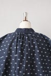軽やかなコットンナイロンのベース生地に、ラメ糸とカラー綿糸を組み合わせてミニマルな飛び柄を表現。 さらに、一つひとつの柄にある房(ふさ)を、職人が手作業で丁寧にカットして仕上げるという、 手間ひまかけた「房出し」技法を用いています。