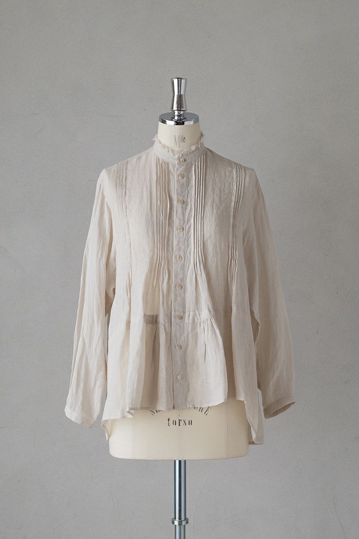 襟は切りっぱなしのデザインで、重ね着をした時に見せるようなスタイリングもお勧め。後ろ身頃がぐっと長めのデザインで、シーズンレスで愛用できるブラウスです。