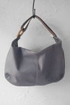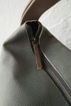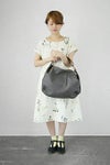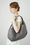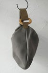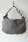 ウッドリングのパーツがワンポイントのセミショルダーバッグ。素材はソフトでぽってりした中肉のシュリンクレザー。粗いシボ感が美しく、使うほどになじんで愛着のわくレザーです。ショルダーベルトをライトグレーのコンビ配色にして軽快で若々しい印象に。ショルダーはリングに通した2本取りでしっかりしています。入れ口が広くてとても使いやすいサイズ感。内側はコットンキャンバス地で、ファスナーポケットと貼りつけポケットの2ポケット付き。柔らかな楕円のビーン(そら豆)型が女性らしいフォルム。持ったときに体に柔らかく添う持ちやすいバッグです。飽きのこないデザインと手頃なサイズ感は、毎日の通勤などにぴったり。