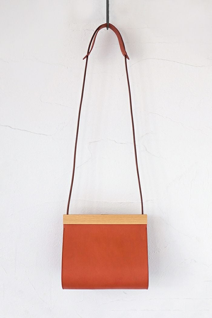 立体的な美しいフォルムに木のぬくもりをあわせ持つ“Clap Wood Pouch”。艶やかな上質のカーフレザーと、