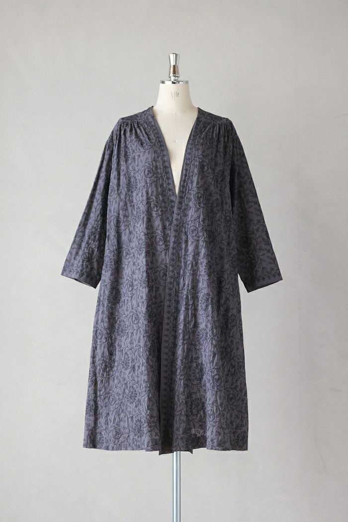 肩と背中にギャザーを入れた、ゆったりとした羽織。スクエアにカットされた後ろの襟ぐりがポイントです。エスニックトーンの色使いが夏らしく、刺繍生地を贅沢に使用した華やかな一着。肌触りのよい薄手ローンは、汗ばむ肌にも心地よく羽織っていただけます。日除け、冷房対策として、ノースリーブの季節に重宝するアイテムです。