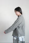 緯糸に水撚りという特殊な技法での撚糸をしたリネンをつかい、ジョーゼットに織り上げたジャケット。 リネンには節があり、強く撚ると細い部分が切れてしまうため、繊維が切れることのないよう水の中でゆっくりと糸をねじり、撚糸を均一に施す『水撚り』という技法で作られた1枚です。