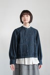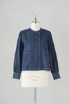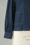 規則的に並んダブルボタンは、トラッドな空気感があり、前のボタンを開けても閉めてもサマになるデザイン。 肩山と袖口にたっぷり入ったギャザーがフェミニンな印象に。袖口はボタン仕様で折り返す事もできます。 共布のデニム生地のくるみボタンにもオリジナリティが感じられます。白いステッチ糸が爽やかなアクセントに。