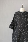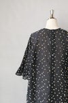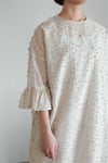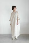 袖にフリルをあしらったデザインのワンピース。 身頃は風をはらむようなゆとりのあるシルエットです。 背面は裾までボタンで開けられる仕様のため、 ボタンをすべて開けて羽織のようにお召しいただける前後2way仕様です。 透け感がある生地のため、パンツとのレイヤードや、 お手持ちのペチワンピースとの重ね着がおすすめです。