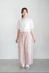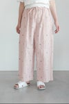 ウエスト紐付きのゴムギャザーワイドパンツ。レースの端切れをコラージュしたようなカットジャカードのテキスタイルを使用したアイテムです。