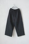 ウエストはゴム+ゴムで調節できるデザイン。ウエスト~太ももまでは綿麻の生地、太もも~裾までのピンタック部分はコットンナイロンシルク生地を使用しました。 ややルーズなシルエットが魅力のアイテムです。