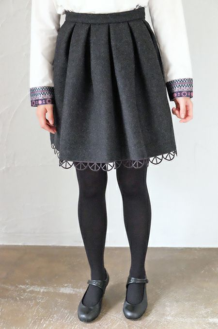 大きなタックを入れて、ふわっとした広がりをだしたミニスカート。裏表で異なる色の生地を二重織りにした上質メルトンを使用しており、あたたかく軽い穿き心地です。さりげなく裾にあしらったオリジナル柄の刺繍レースが、清楚で女性らしいデザイン。手持ちのニットやブラウスと、コーディネイトしやすく、トップス次第で、秋冬のフォーマルシーンにも。シンプルだけど可愛い存在感のあるシルエットがYOSHIYOならでは。