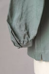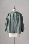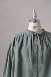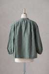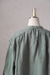 前身頃は、衿ぐりから肩ヨークにかけてギャザーを入れ、 分量感を持たせることで、 軽やかな麻の流動感が美しいブラウスになっています。