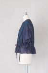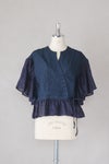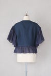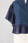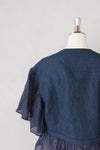 ベースはインディゴチェック地、袖と裾のフリル部分はリネン地を組み合わせたアイテム。