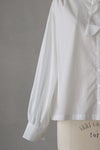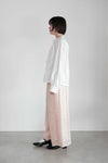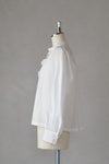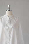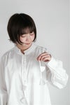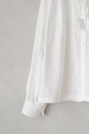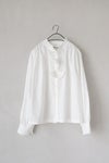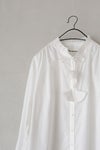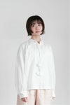 チョウチョ結びにしたり、垂らしたり自由に演出できます。襟元はタックで立体的に仕立てたスタンドカラーで、タック先はピコカットで軽く仕立てた細部のこだわりを感じる1枚。
