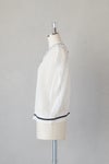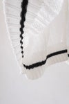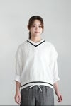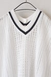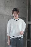 襟ぐりと裾はライン入りのリブ編みで、配色のラインがポイントに。