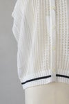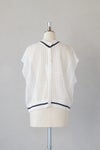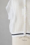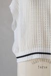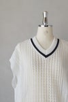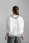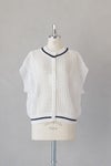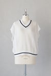 浅めのVネックとクルーネックのどちらを前にしても着用できるデザインで、センターには貝ボタンが並んでいます。ブラウスやワンピースの上に重ねて、涼しく重ね着を楽しめます。
