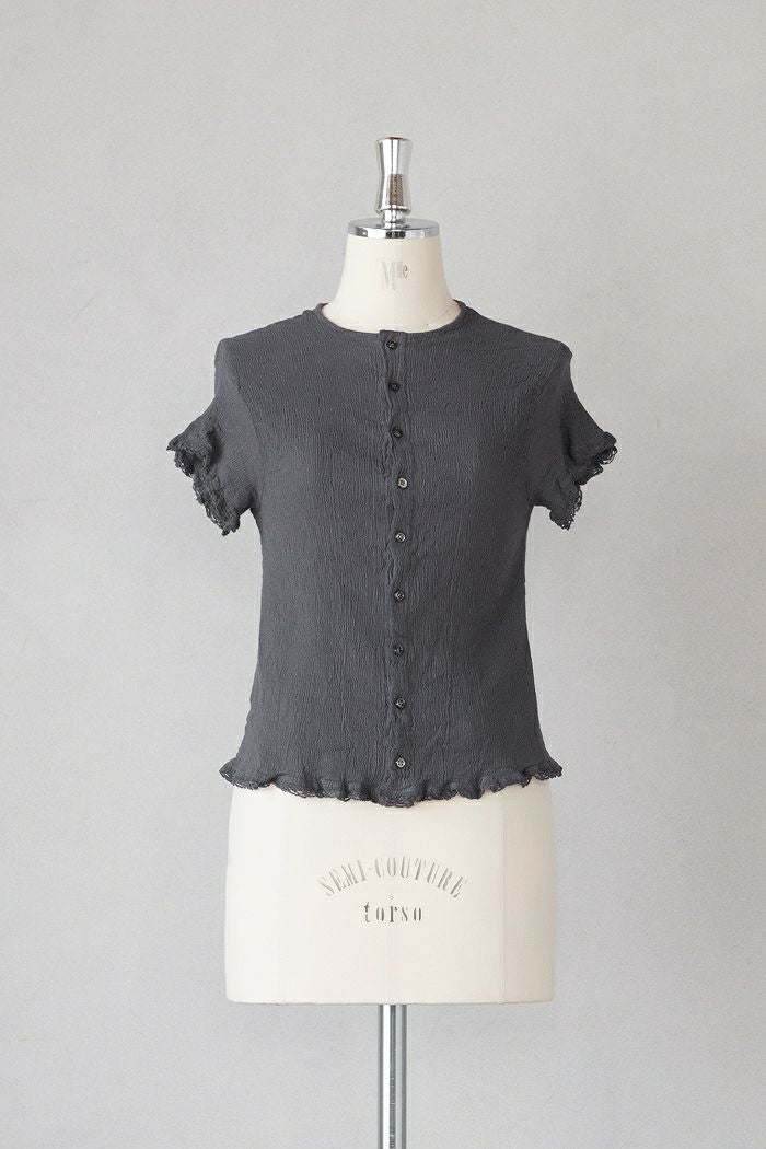 袖口と裾にレースを施したシンプルな前開きブラウス。