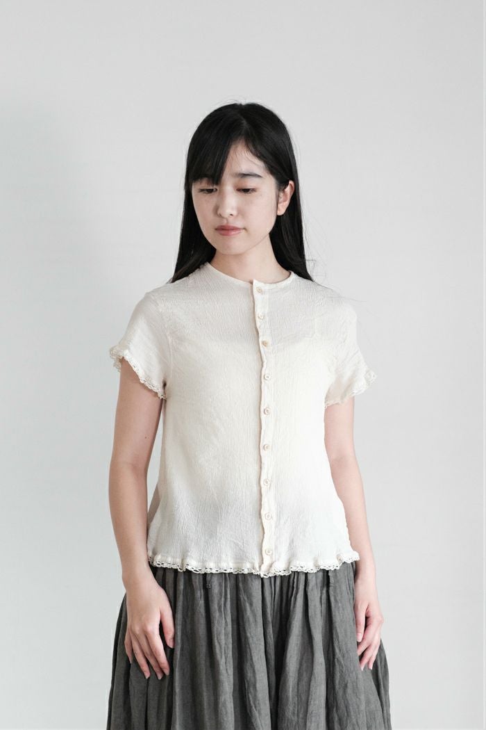 袖口と裾にレースを施したシンプルな前開きブラウス。