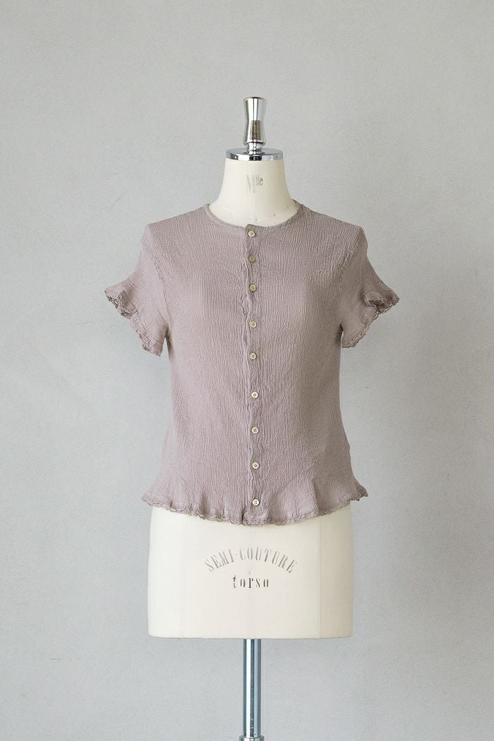 袖口と裾にレースを施したシンプルな前開きブラウス。