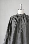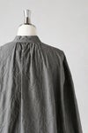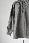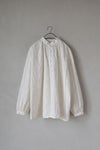 クラシカルな雰囲気のバンドカラーのギャザーシャツ。 襟ぐりに細かなギャザーを寄せており、 裾周りがふんわりとした、優しいシルエットになっています。 身幅が広く、肩は自然にドロップするので、 とてもリラックス感のある着心地。 きれいめなボトムスと合わせれば、きちんとした印象に。 デニムなどでカジュアルに着こなすのも素敵です。
