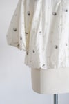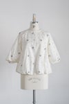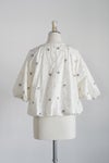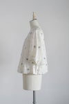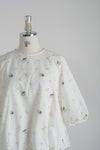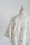 ブラウスいっぱいに広がる立体的なモチーフが特徴的なアイテム。シンプルなボトムスと組み合わせてブラウスを主役にしたスタイリングがお勧めです。群馬県桐生市で制作。