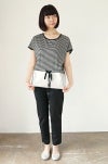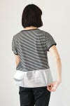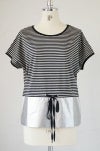 裾をシルバー箔プリントで切り替えた可愛いボーダープルオーバー。ベーシックなボーダーTシャツに、おしゃれなアレンジを加えています。上質で肌触りのコットンボーダーは着心地抜群。短めの袖が女の子らしく、涼しげなゆるめシルエットです。切替部分の黒リボンがワンポイントに。毎日のコーディネイトに大活躍しそう。
