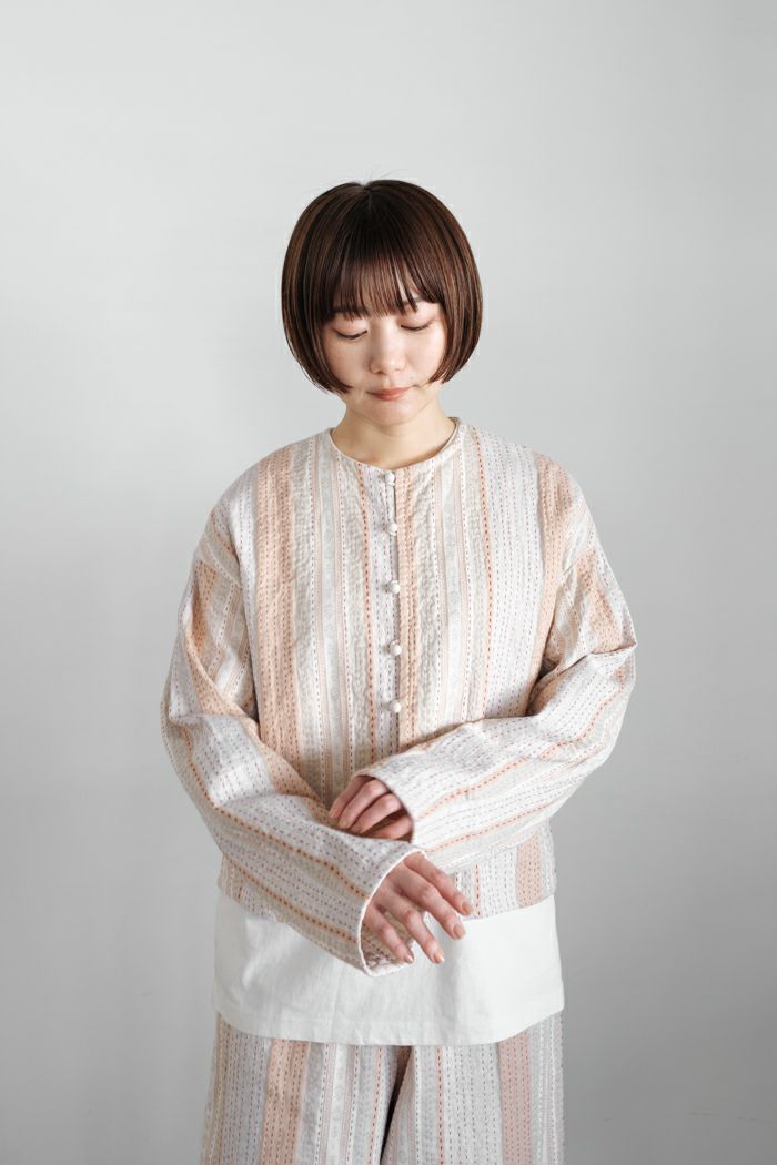 伝統工芸のカンタ(ラリー)キルトをイメージしたジャカードのテキスタイルのジャケット。