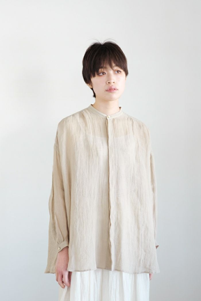 程よくリラックス感のある、 少しオーバーサイズのバンドカラーシャツ。 素材感が引き立つ、 シンプルで飽きのこないデザイン。 一枚での着用はもちろん、 カーディガンのような羽織りとしてお使いいただくのもオススメです。